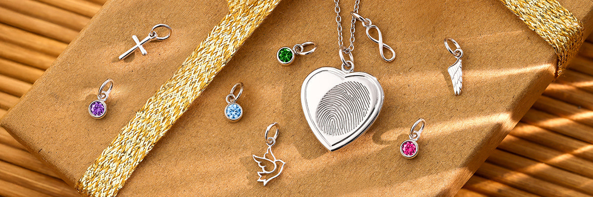 Further personalize your custom Jewelry and Keepsakes with unique accessories. Whether a Symbolic Charm, Birthstone Charm, Chain, or Rubber Silencer, each accessory brings unmatched levels of meaning and connection to your piece. The perfect complement to your Loved One’s one-of-a-kind print.