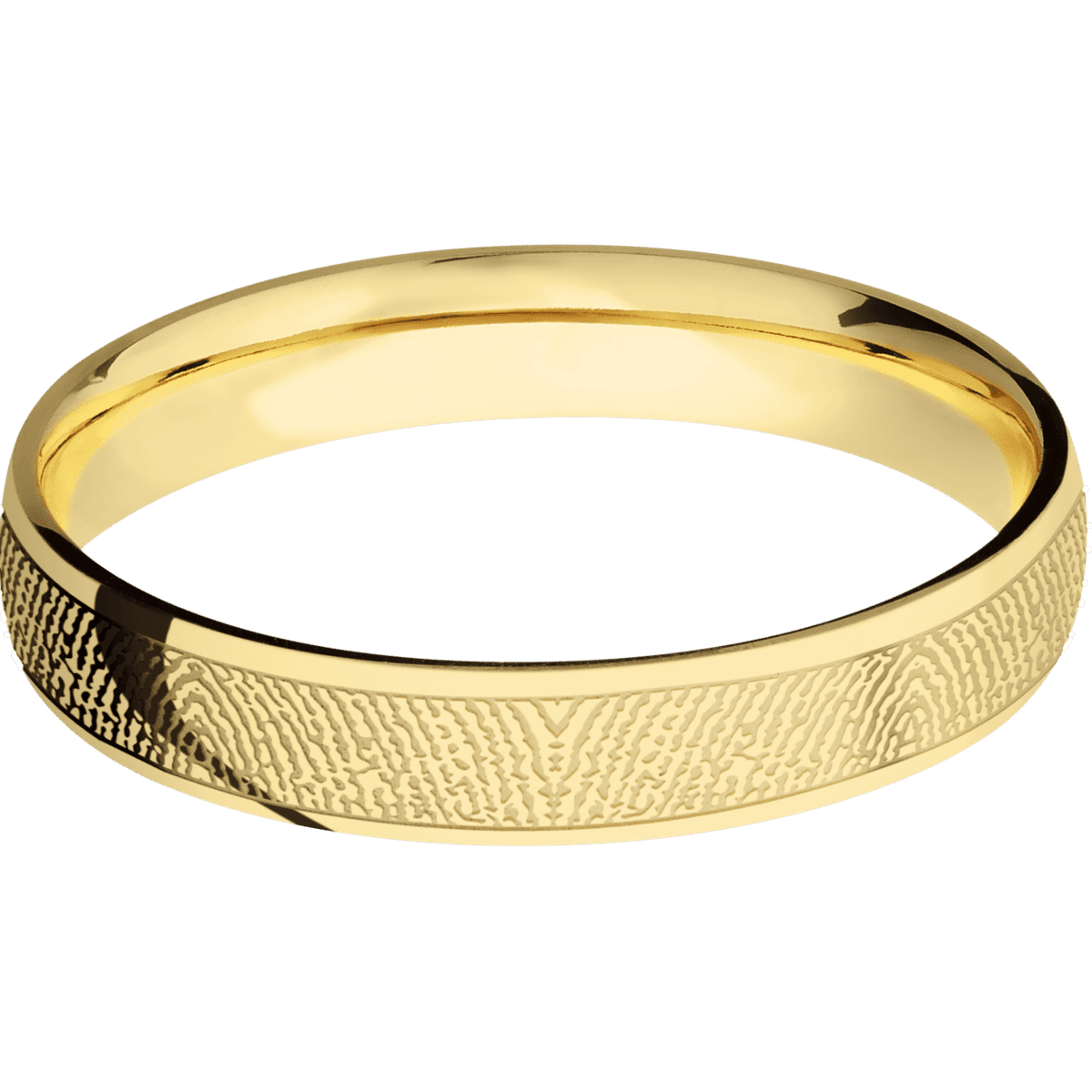 4 mm wide/Domed/10K Yellow Gold band with a laser carved Finger Print pattern.