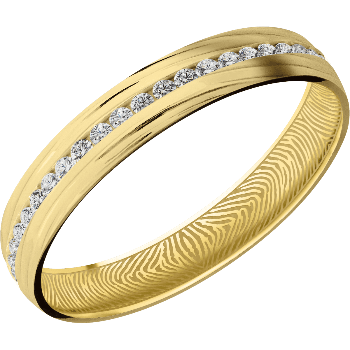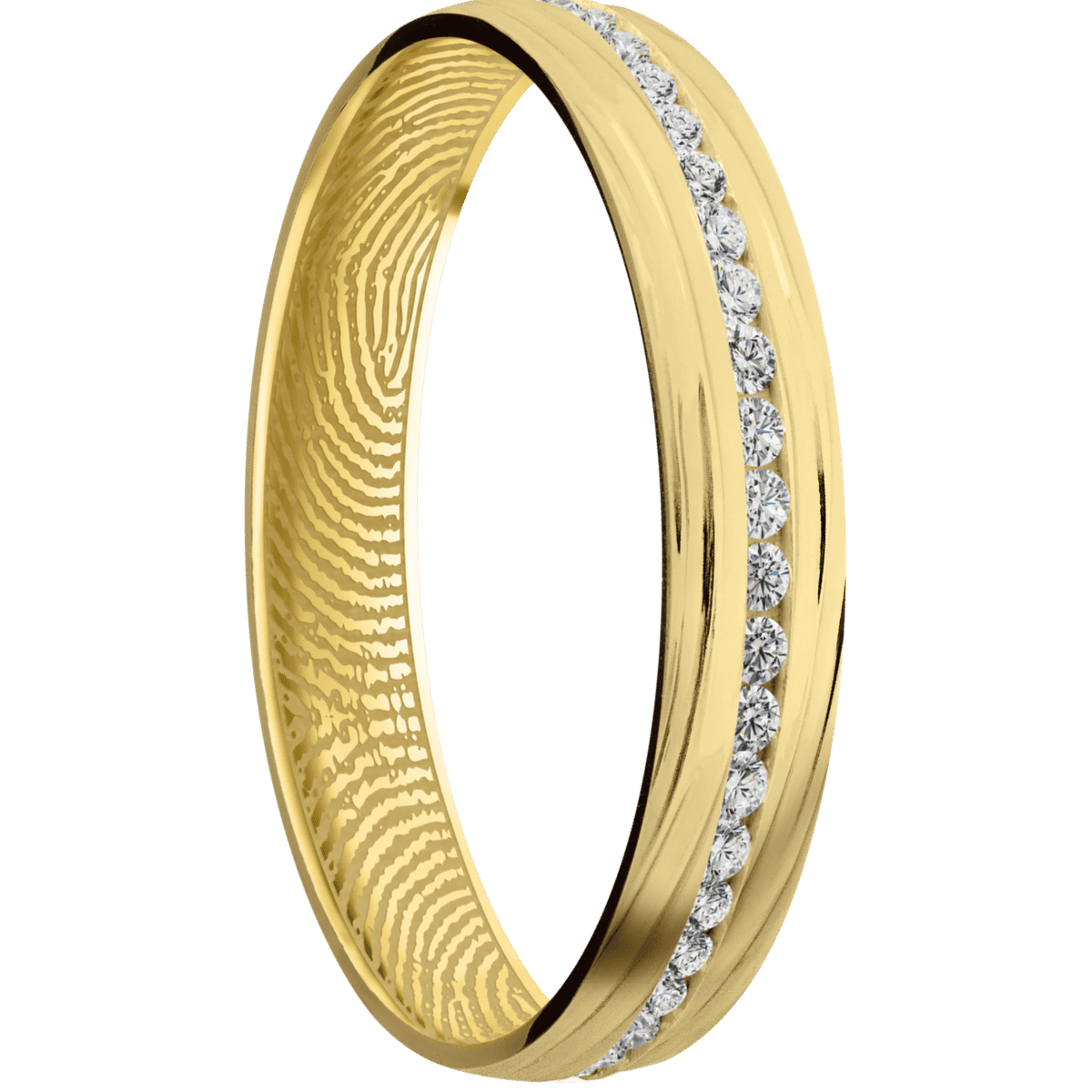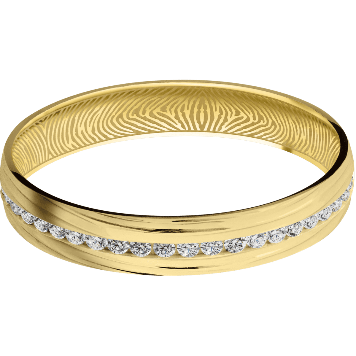 4 mm wide/Domed/10K Yellow Gold band with an Eternity arrangement of .015 carat Round Lab Grown Diamond (ST) stones in a Channel setting.