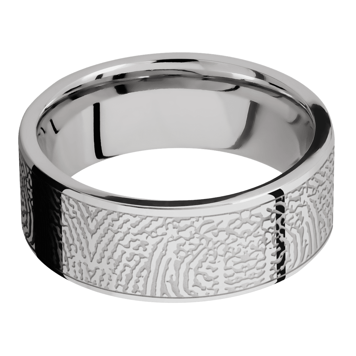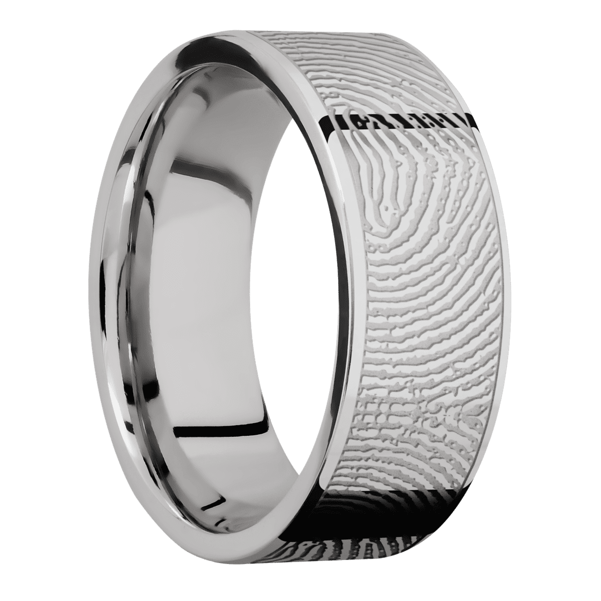 8 mm wide/Flat/Cobalt Chrome band with a laser carved Finger Print pattern.