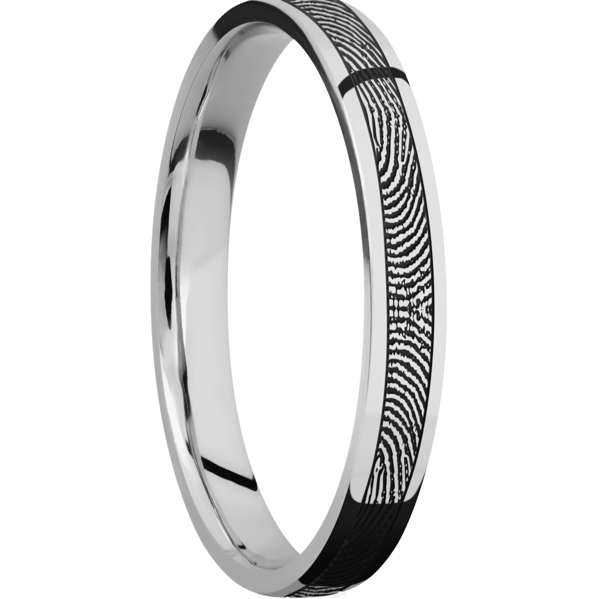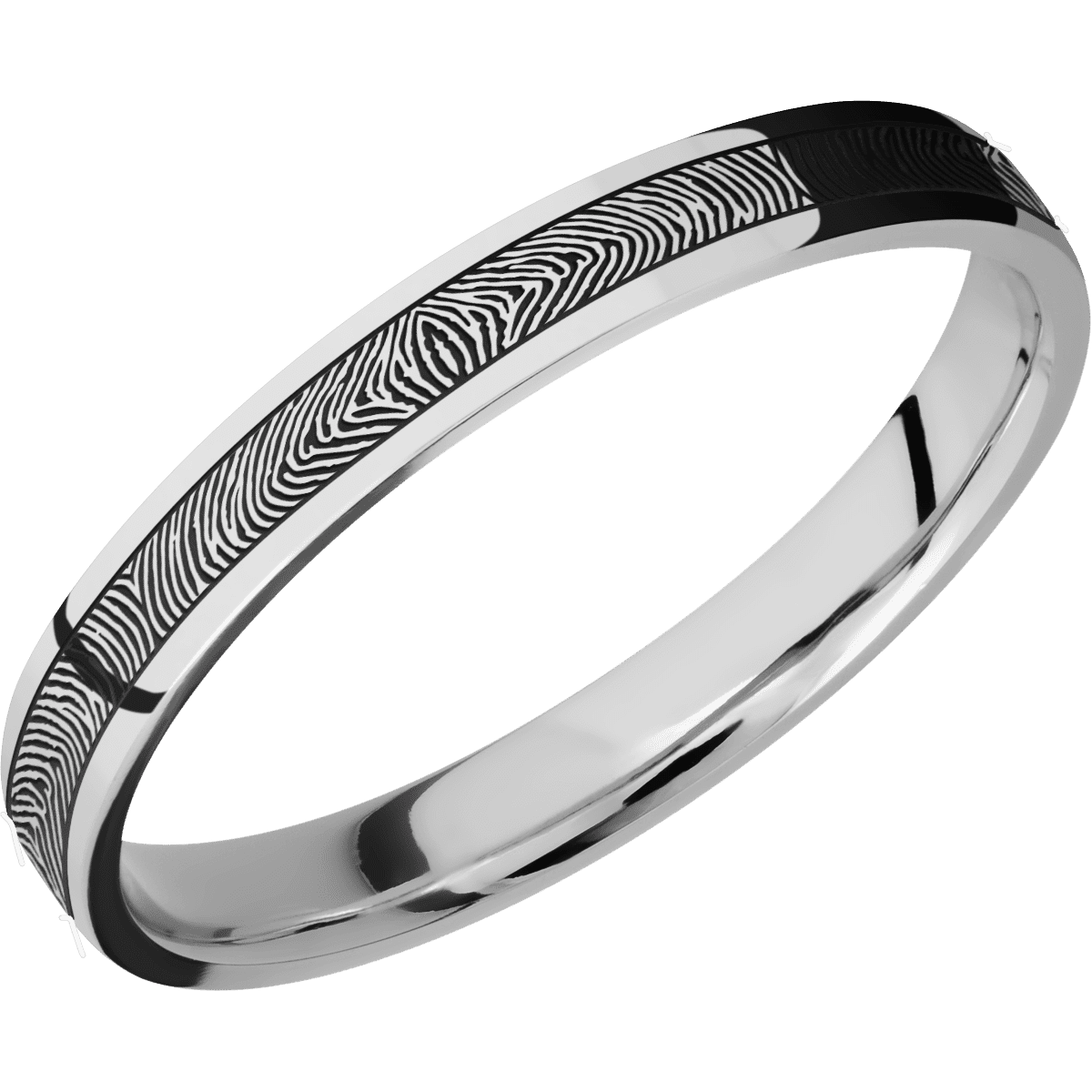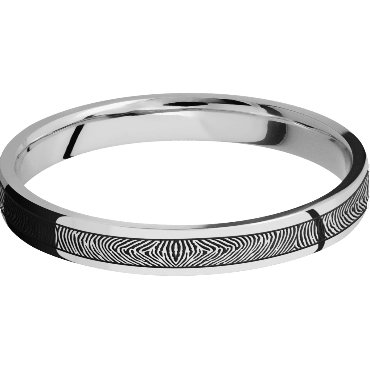 3 mm wide/Flat/Palladium Silver band with a laser carved Finger Print pattern.