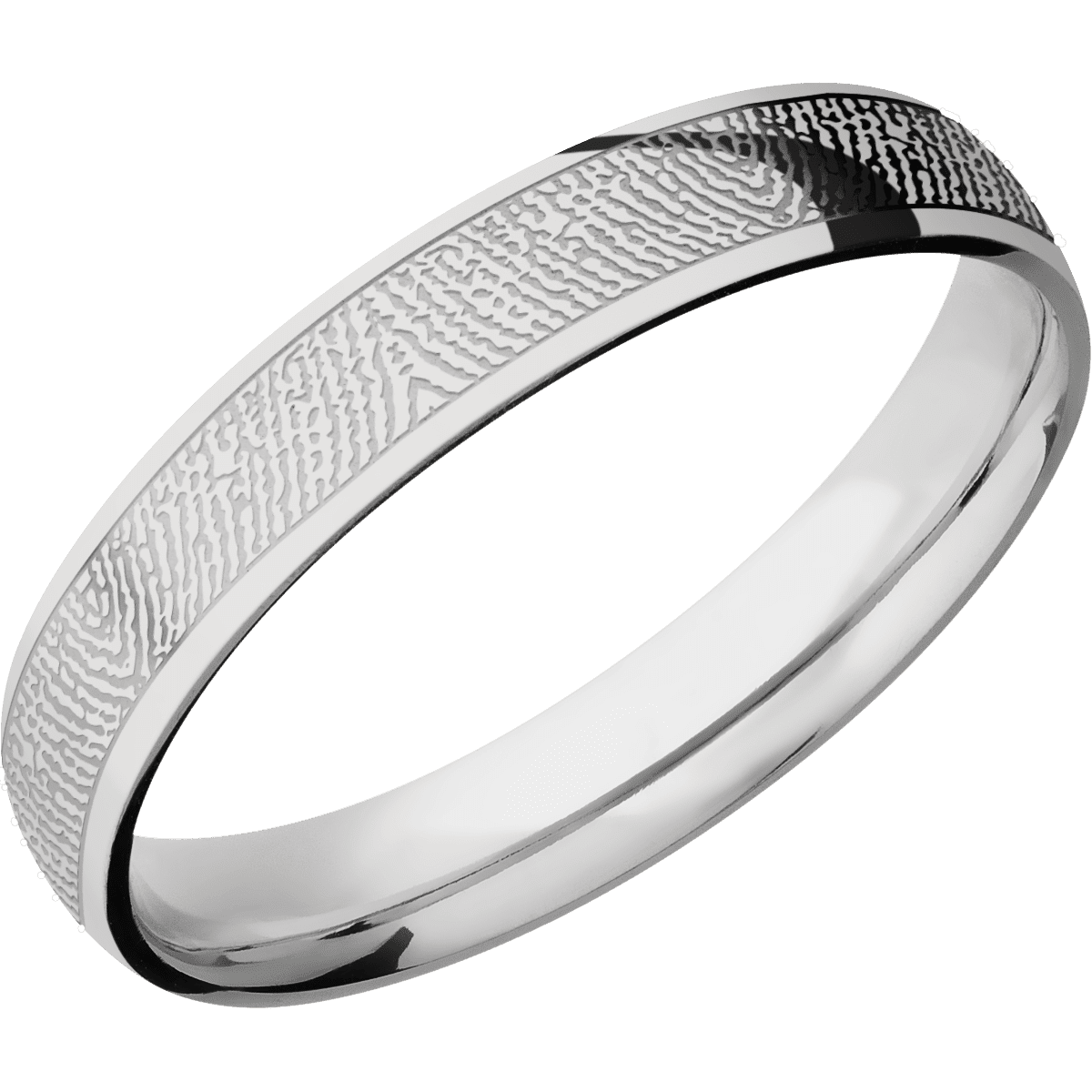 4 mm wide/Domed/Palladium Silver band with a laser carved Finger Print pattern.