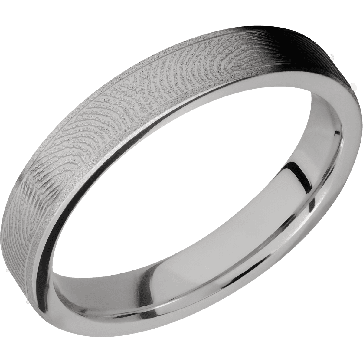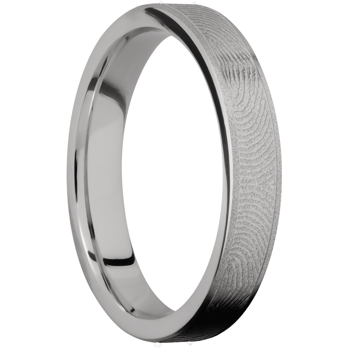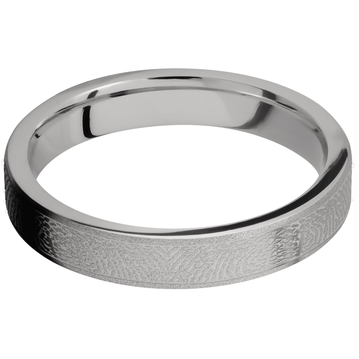4 mm wide/Flat/Platinum band with a laser carved Finger Print pattern.