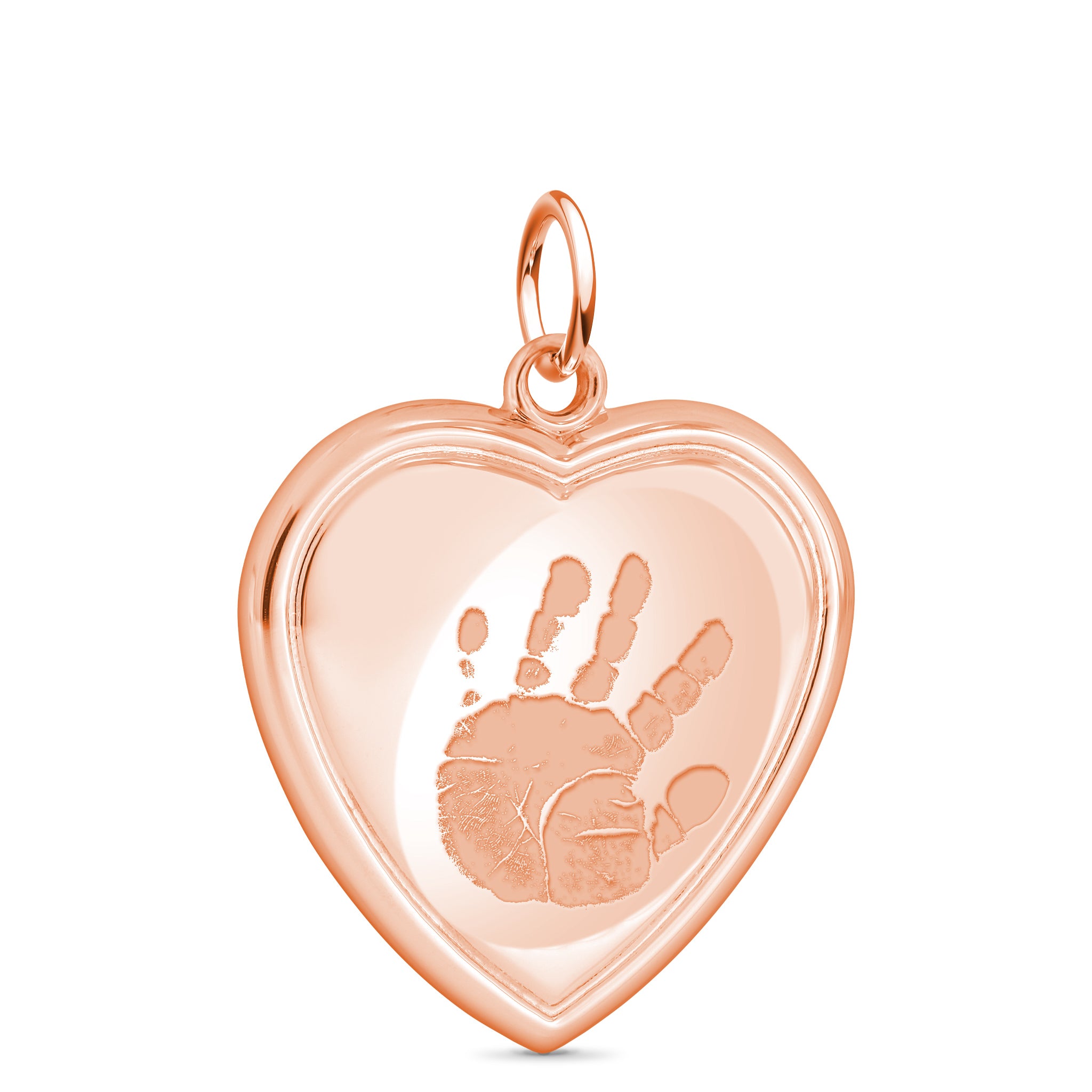 Experience unmatched connection to your Loved One with a Fingerprint Pendant in gleaming 14k Rose Gold. Beautifully balanced and finished, our heart-shaped Pendant features a raised, rounded edge, and the engraved fingerprint pattern nestled in a debossed oval to suggest the light presence of a fingertip's touch. Handmade to be as one-of-a-kind as the person it represents, this customizable Jewelry piece can be worn as a Necklace, kept as a memorial Keepsake, or given as a gift to someone you love.