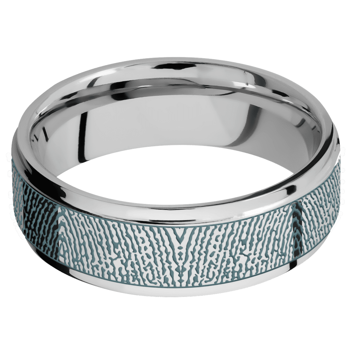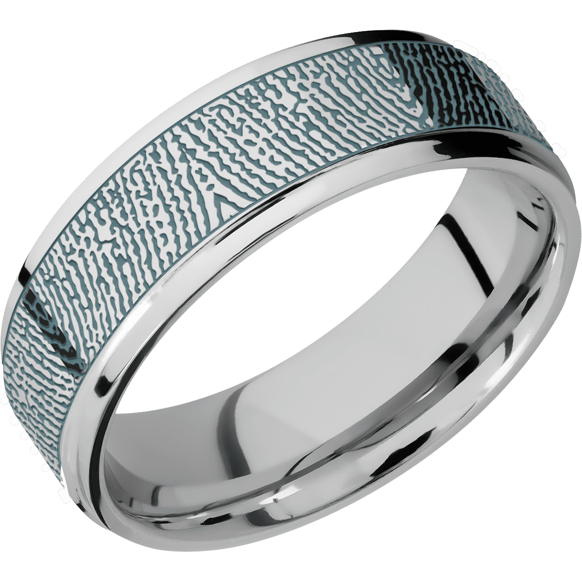 7 mm wide/Flat Grooved Edges/Stainless Steel band with a laser carved Finger Print pattern.