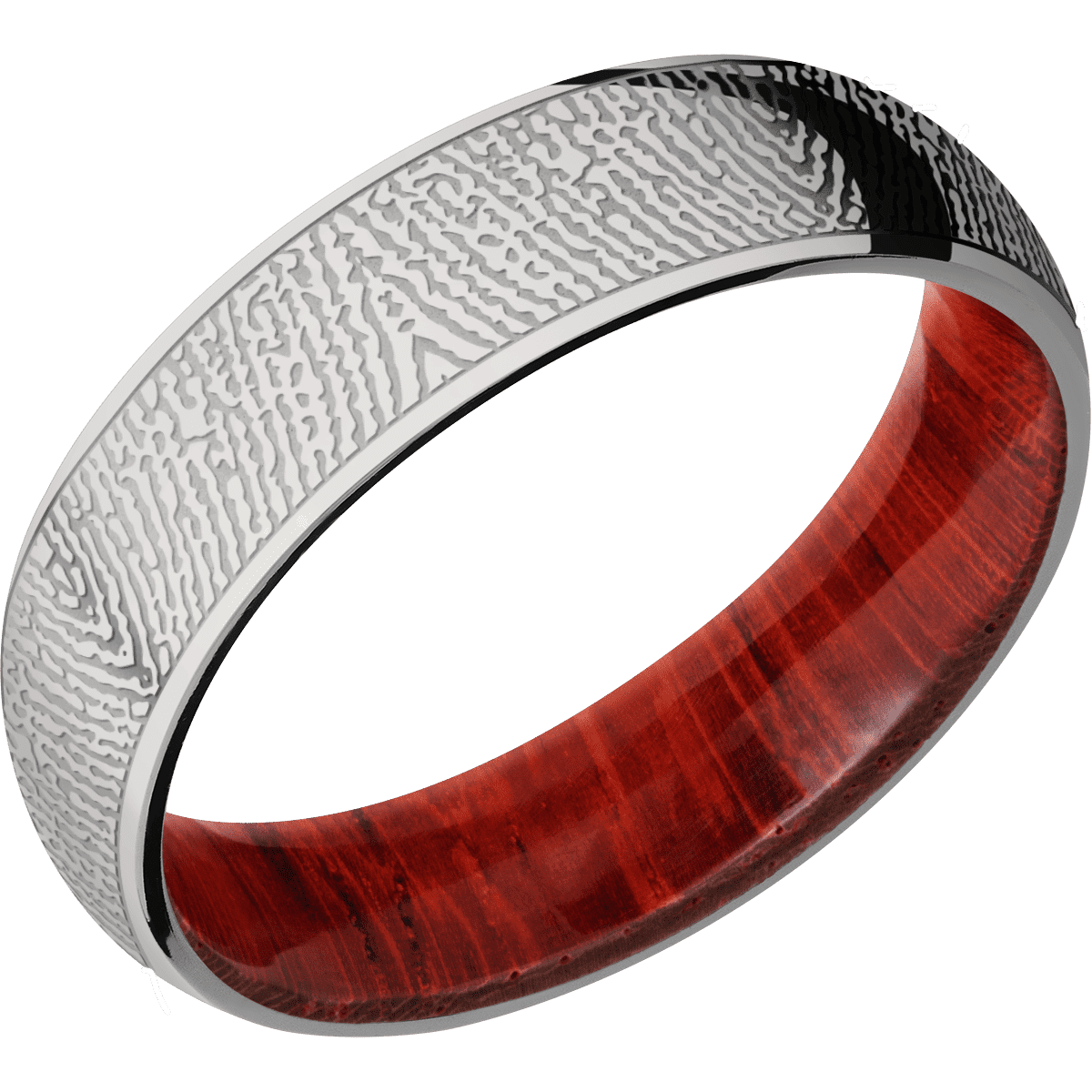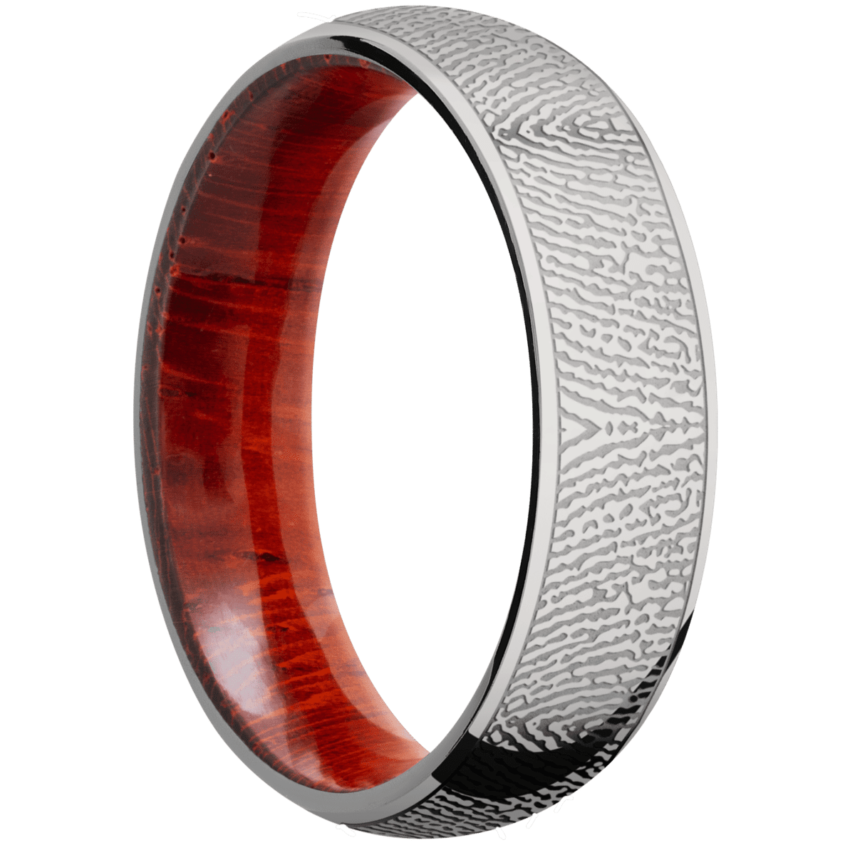 6 mm wide/Domed/Titanium band with a laser carved Finger Print pattern also featuring a Padauk sleeve.